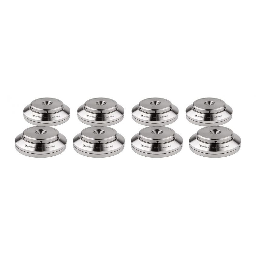 Construction quality is equally impressive. Each footer is crafted from machined stainless steel, providing both durability and a visually refined finish. The polished surfaces and precise geometry not only serve an aesthetic purpose but also contribute to the functional stability of the design. The swing layers operate smoothly, and the overall build reflects the level of precision typically associated with luxury audio accessories.